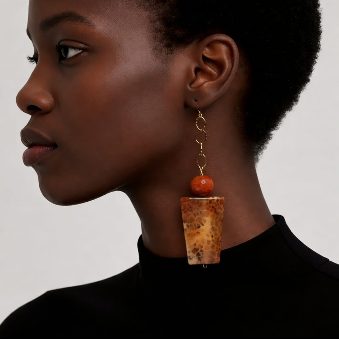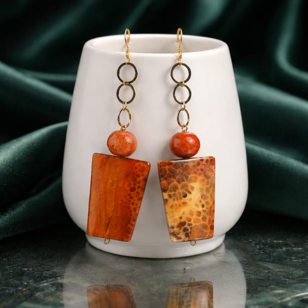 Estos pendientes hechos a mano destacan por la intensidad y el carácter único del ágata roja de fuego, una piedra conocida por sus cálidas vetas y efectos jaspeados que hacen que cada pieza sea única. El diseño combina una gota de ágata facetada en la parte superior con un llamativo colgante trapezoidal, creando un elegante y atractivo juego de volúmenes.