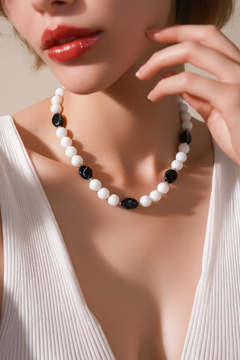 Elegante gargantilla elaborada con cuentas de concha de satén color marfil y auténticos óvalos de sardónice brasileño en un sofisticado contraste en blanco y negro. Cada pieza está separada por pequeñas esferas de cristal Swarovski que aportan brillo y un acabado refinado. Los detalles en plata 925 garantizan durabilidad, calidad y un toque de lujo discreto.