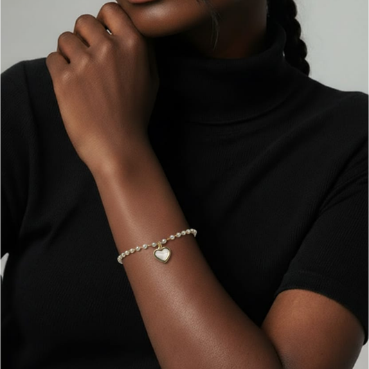 Bracciale in acciaio inossidabile dorato con perle bianche e ciondolo a forma di cuore in madreperla