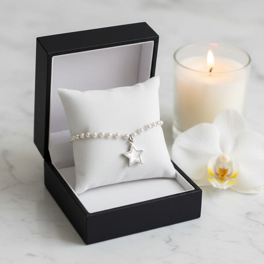Bracciale in acciaio inossidabile con perle bianche e ciondolo a forma di stella in conchiglia naturale