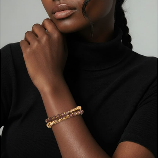 Bracciale doppio con pietra occhio di gatto e perline oro rosa