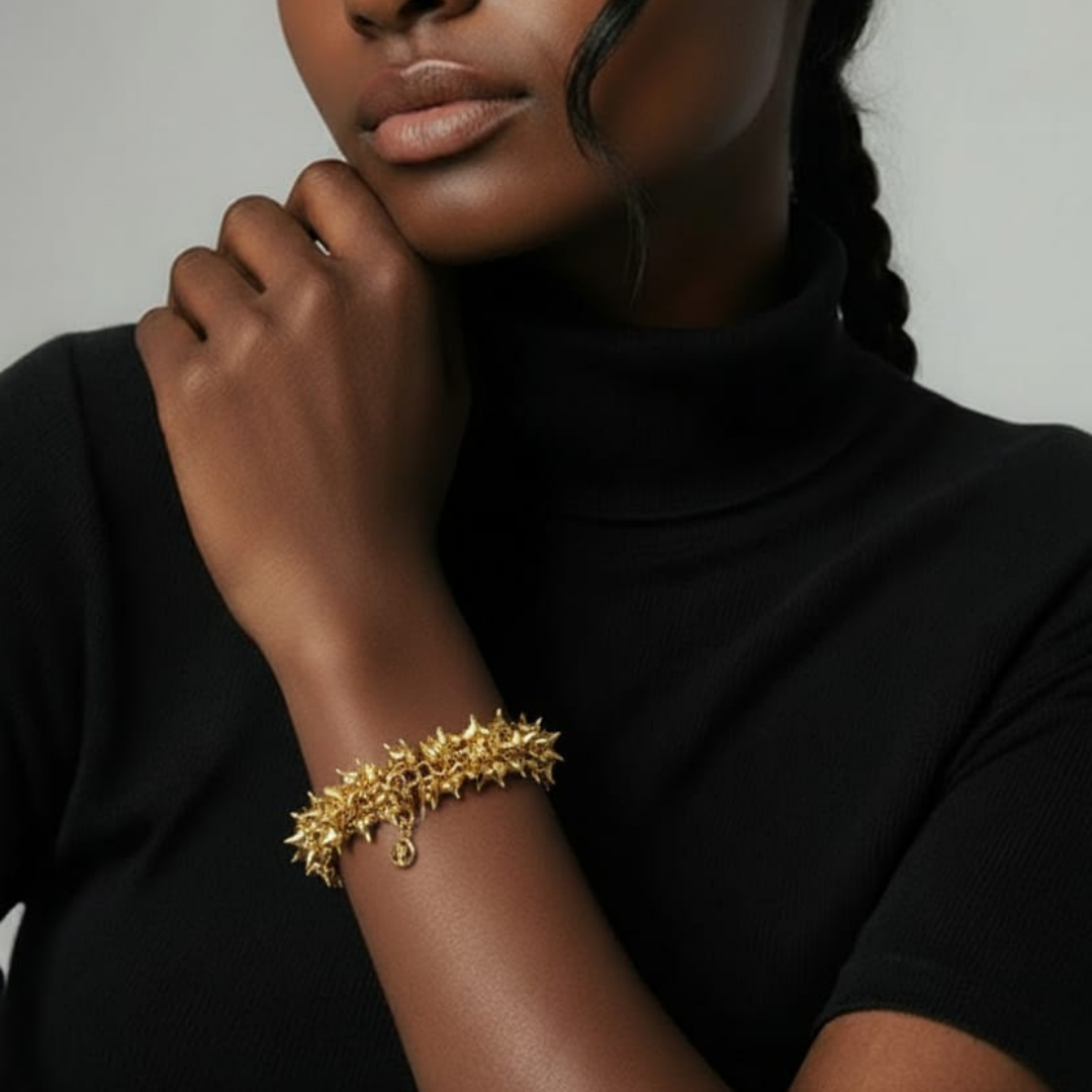 Questo bracciale si distingue per il suo design composto da più piccoli cuori dorati, uniti tra loro per creare un pezzo sorprendente, luminoso e di grande movimento. Ogni cuore ha una finitura lucida che riflette intensamente la luce, offrendo un effetto lussuoso e sofisticato. È l'accessorio perfetto per aggiungere un tocco romantico ed elegante a qualsiasi look, ideale sia per le occasioni speciali che per l'uso quotidiano.